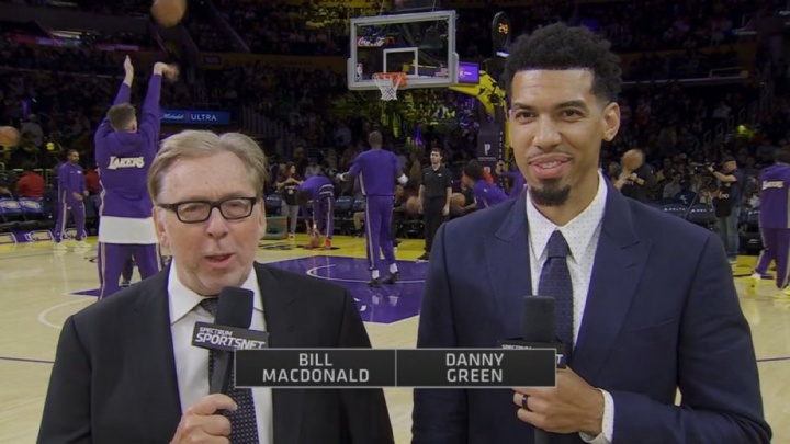 今日前NBA球员、现湖人电台Spectrum SportsNet解说员丹尼-格林现场解说湖人VS勇士的季前赛。