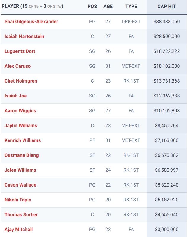10月19日讯 雷霆25-26赛季的18个名额正式拉满:15份正式合同+3份双向合同。