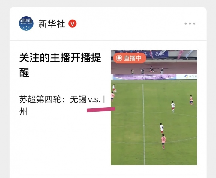 新华社上轮直播常州比赛也玩梗,直播间标题为“苏超第四轮:无锡v.s.丨州”。