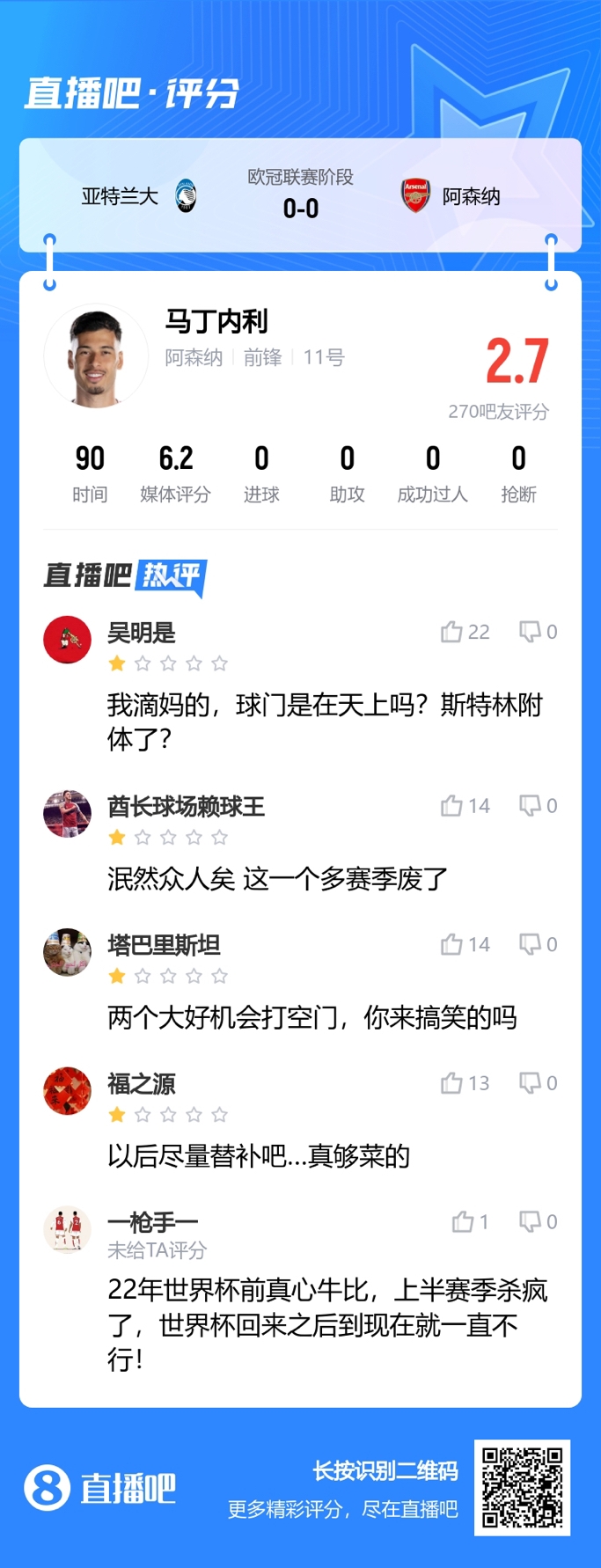 欧冠联赛阶段首轮,阿森纳客场0-0逼平亚特兰大,赛后枪迷普遍对这场比赛的表现不满,吧友给马丁内利打2.7分,热苏斯2.9分。