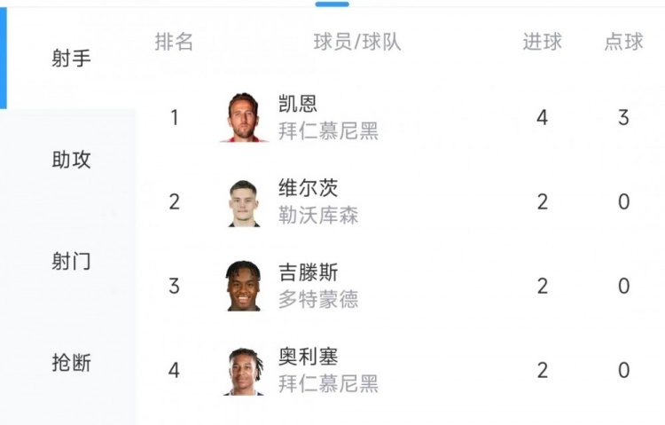 足坛汇9月20日讯 欧冠首轮比赛尘埃落定,凯恩以4球领跑射手榜,维尔茨、吉滕斯、奥利斯打进2球并列次席。