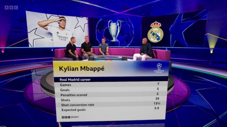 足坛汇9月19日讯 BBC统计了姆巴佩加盟皇马以来的比赛数据,这位法国前锋出战7场打进5球,射门转化率13%。