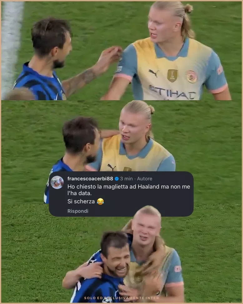 足坛汇09月19日讯 欧冠首轮,国米0-0客平曼城,哈兰德赛后与阿切尔比交流。