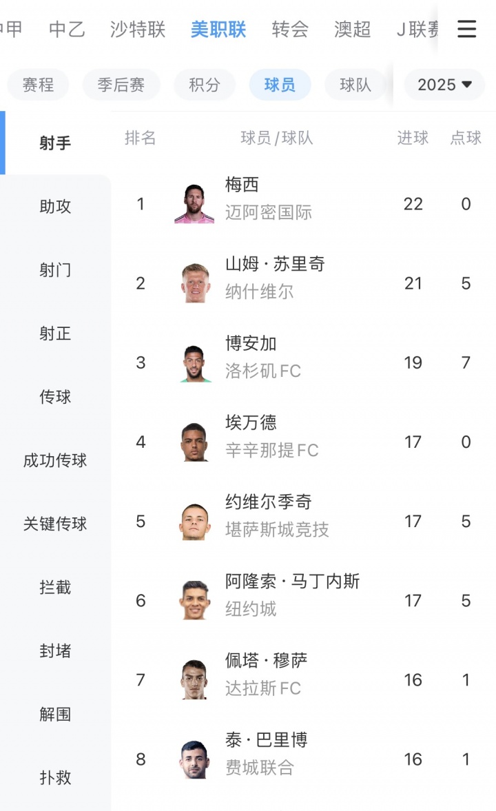 09月21日讯 迈阿密国际3-2险胜华盛顿联,梅西贡献2射1传,重新登顶美职联射手榜,本赛季美职联22场22球0点球。
