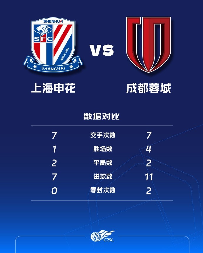 期间,申花攻入7球,没有完成过零封;蓉城攻入11球,完成过2次零封。