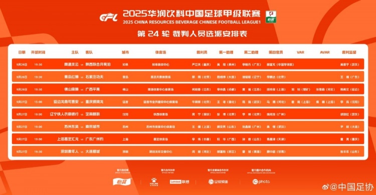 9月26日讯 中甲联赛官方公布联赛第24轮裁判选派,