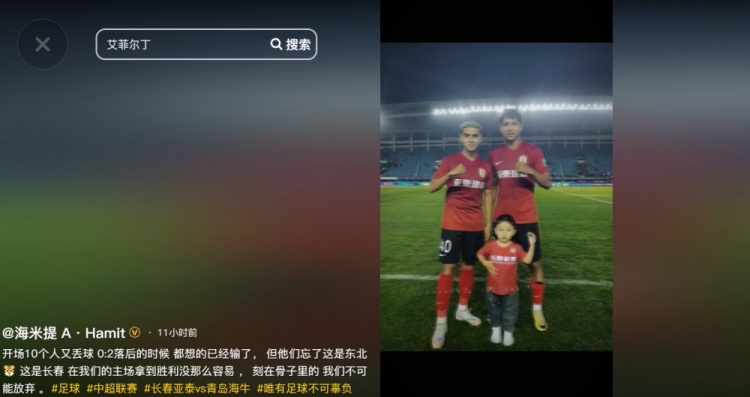 阿不都海米提写道:开场10个人又丢球,0-2落后的时候都想的已经输了,但他们忘了这是东北虎,这是长春,在我们的主场拿到胜利没那么容易,刻在骨子里的,我们不可能放弃。