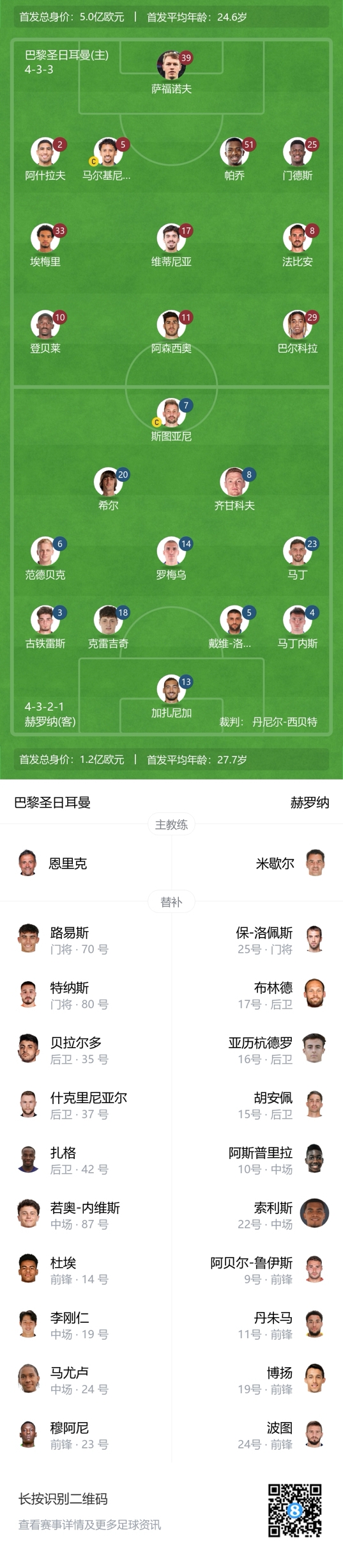 巴黎首发:39-萨福诺夫、2-阿什拉夫、5-马尔基尼奥斯、51-帕乔、25-努诺-门德斯、8-法比安、17-维蒂尼亚、33-扎伊尔-埃梅里、10-登贝莱、11-阿森西奥、29-巴尔科拉