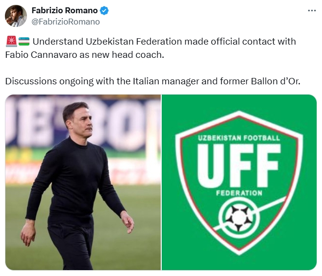 罗马诺获悉,乌兹别克斯坦足协已经正式接触了卡纳瓦罗,讨论其执教乌兹别克斯坦国家队的事宜,目前双方的谈判正在进行。