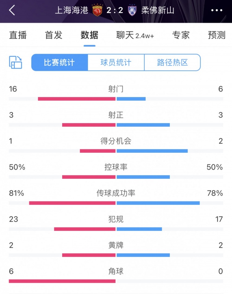足坛汇9月18日讯 今晚进行的亚冠精英联赛首轮比赛,上海海港主场2-2战平柔佛新山。本场比赛,尽管海港占据了数据上的优势,但最终却只能接受2-2平局的结果。
