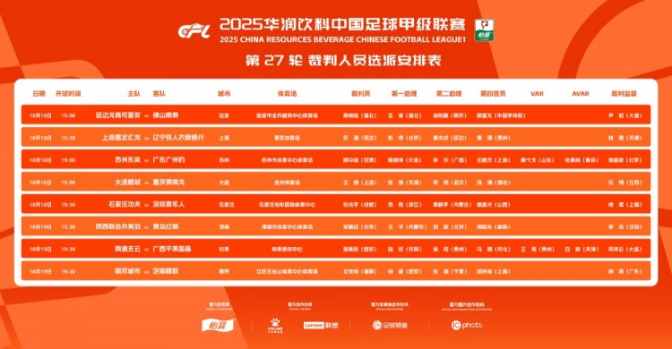 10月18日讯 2025华润饮料中甲联赛第27轮裁判选派结果公布,其中苏州东吴vs广东广州豹、南通支云vs广西平果两场焦点战役安排有VAR裁判。