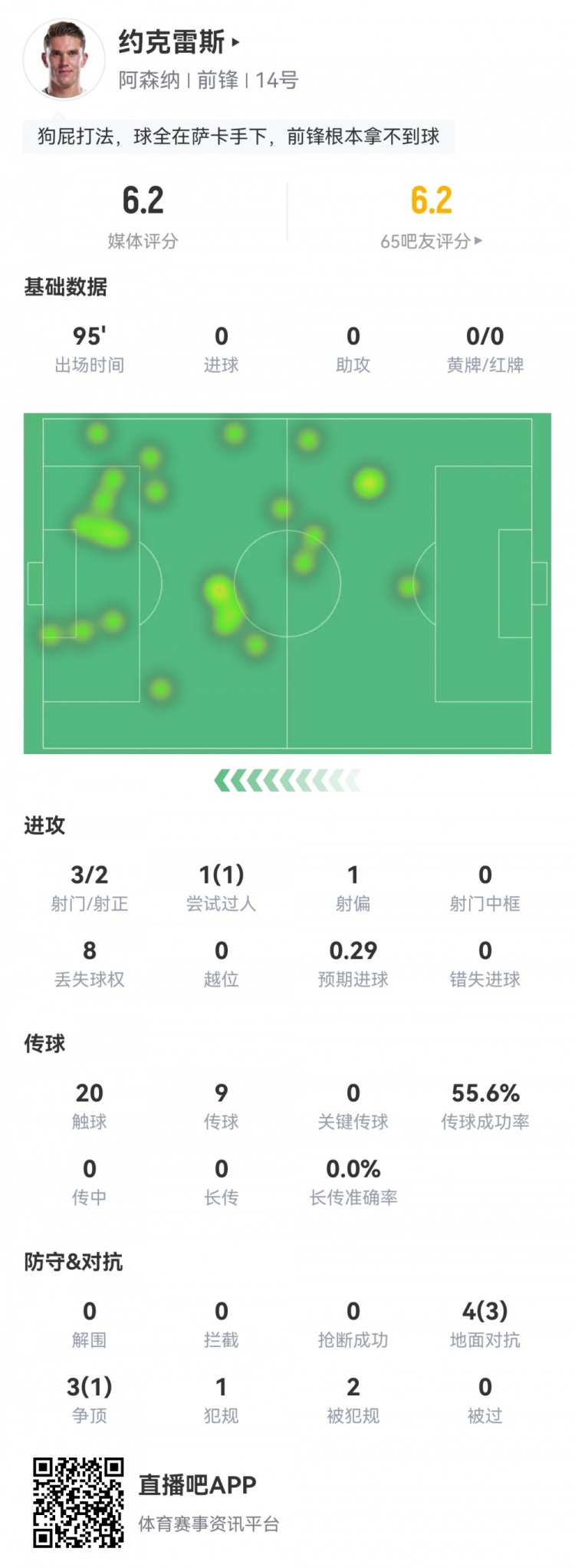 10月19日讯 本轮英超,阿森纳1-0客胜富勒姆。此役约克雷斯首发95分钟被换下,球员全场重点数据如下↓
