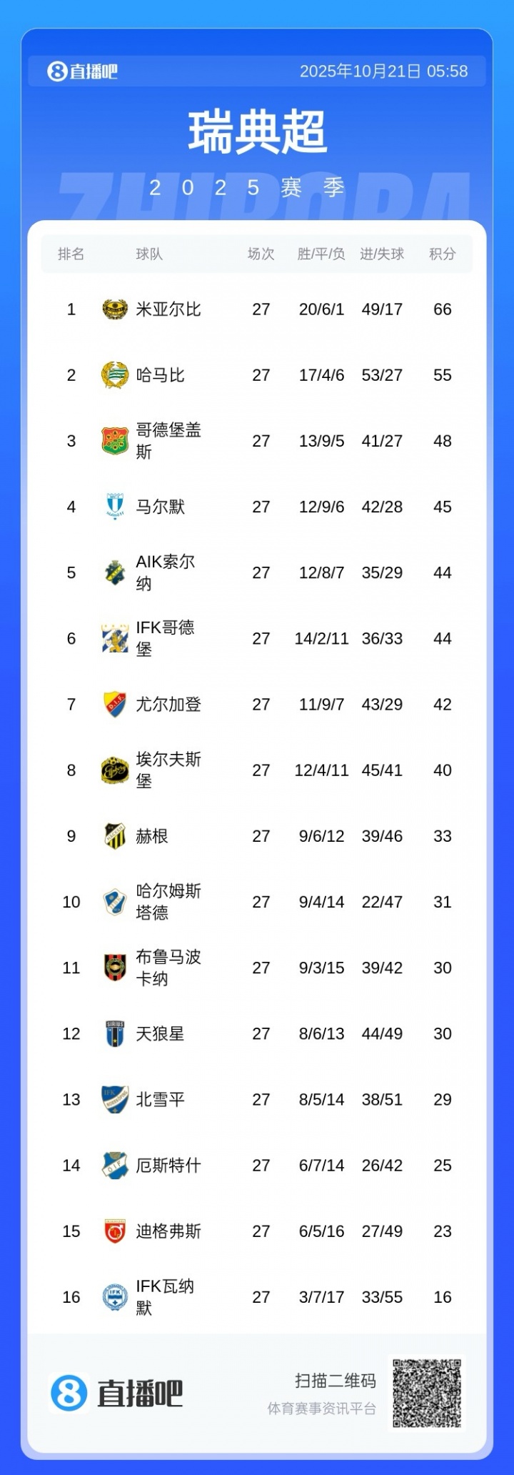 见证奇迹!1500人渔村球队加冕瑞典超冠军,米亚尔比提前3轮夺冠2025-10-21
