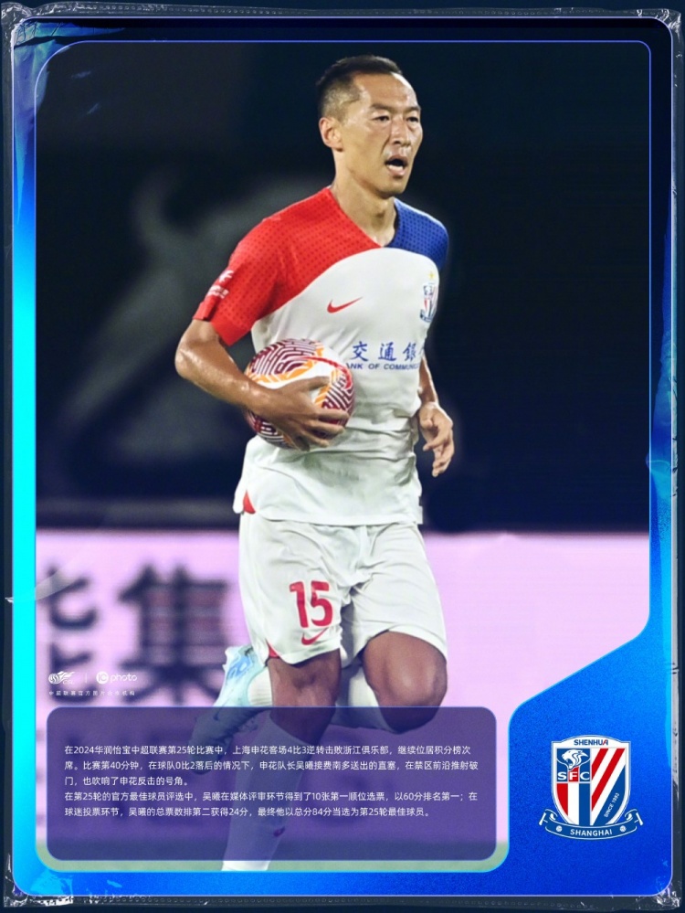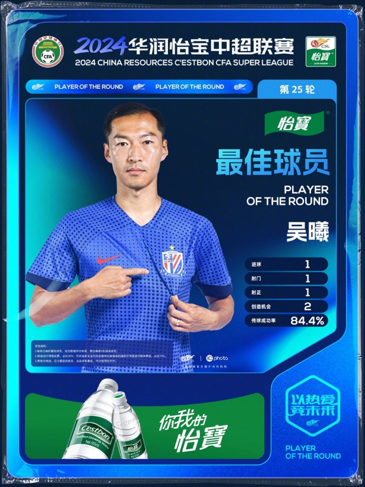 足坛汇9月18日讯 中超联赛官方公布了第25轮最佳球员,上海申花球员吴曦当选,他在球队0-2落后的情况下攻入一球,吹响了申花反击的号角。