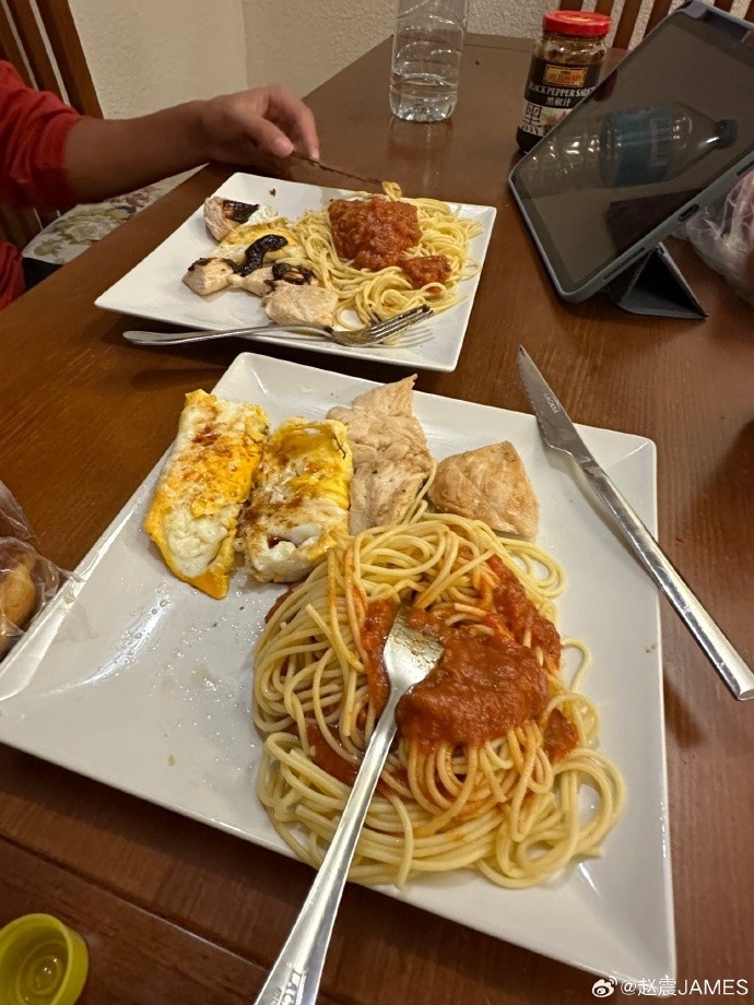 足坛汇9月18日讯 今天,媒体人赵震在社媒展示了两名留洋球员杜月徵和宋恩泽在西班牙的日常饮食。
