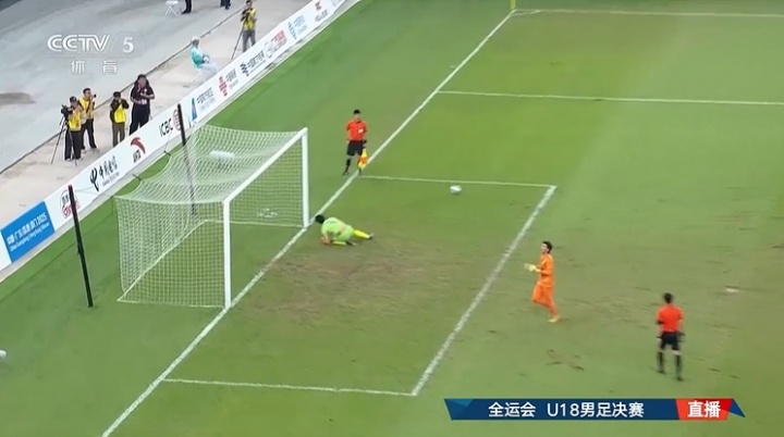10月25日讯 全运U18男足决赛,辽宁队点球大战5-4击败山东队夺金牌,点球大战第5轮,山东队门将依合散扑点后立马失点,错失为球队赢下比赛的机会,辽宁队替补换上的门将鞠铭泽扑出了他的点球。
