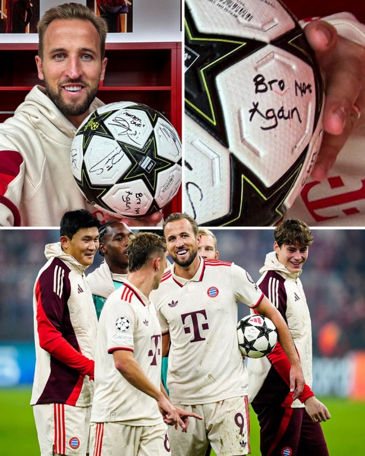 凯恩连续2场比赛至少打进3球,他赛后拿走了比赛用球。有队友在球上签字:兄弟别再这样了(bro not again)。