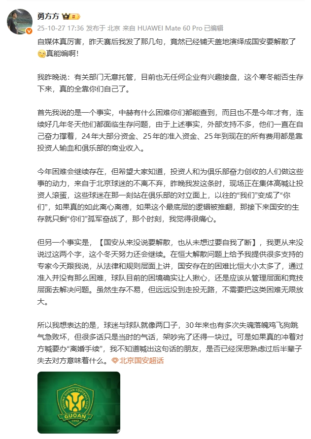 10月27日讯 昨日,媒体勇方方发文谈到了国安如今的境遇不佳引发球迷讨论。今日,该媒体人再次发文澄清有关昨日的言论。