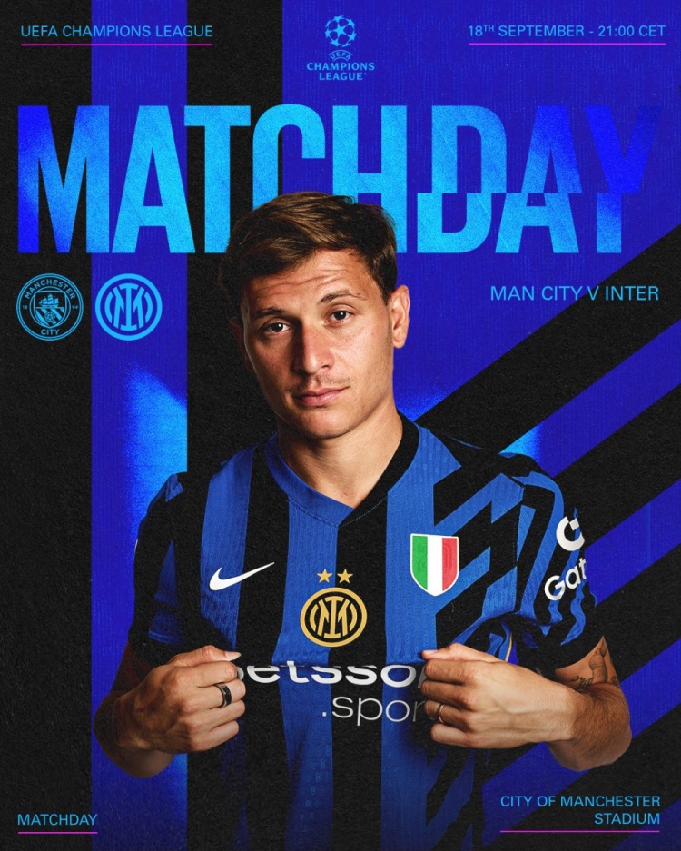 足坛汇9月18日讯 国米在推特上发布海报为欧冠和曼城的比赛预热,巴雷拉出镜。