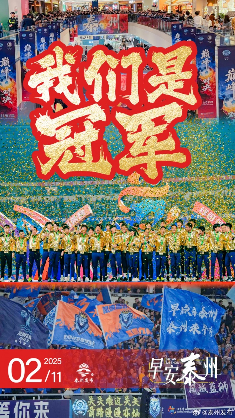 11月2日讯 首届苏超落下帷幕,泰州队点球击败南通队夺得冠军。“泰州发布”发文称:相信相信的力量!相信梦想!相信奇迹!!