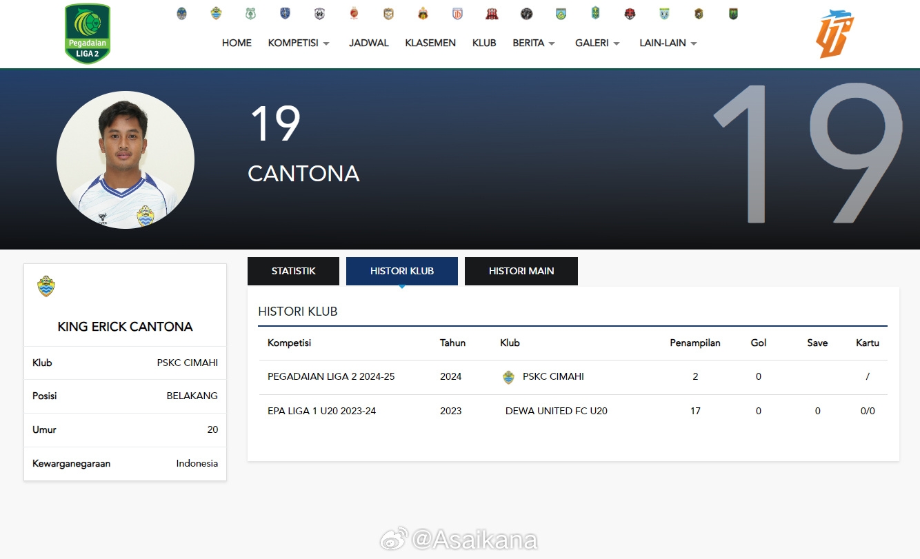 印度尼西亚乙级联赛芝马墟队的一名20岁球员名叫坎通纳。