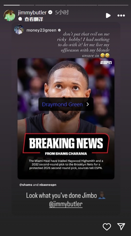 追梦得知消息后,在Instagram上艾特巴特勒:“Jimbo,你看你干的好事!”