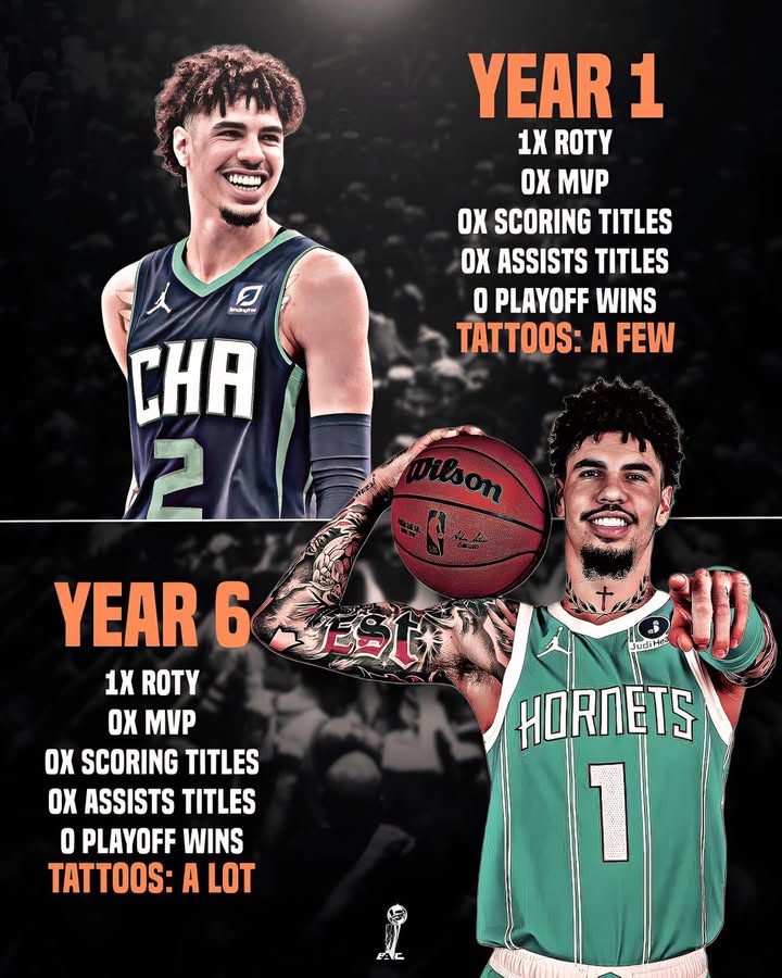 6年生涯:最佳新秀、0MVP、0得分王、0助攻王、季后赛0胜、文身更多了