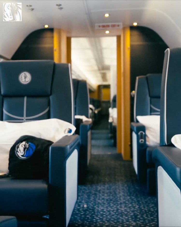 其中飞机的升降梯加上了独行侠的Logo,飞机上的地毯、座椅进行了升级,然后多处细节都加上了独行侠的Logo点缀。