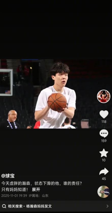 有网友截图表示,11月1日晚间,杨瀚森的妈妈抖音发布状态,似乎意有所指:“今天虚胖的瀚森,状态下滑的他,谁的责任?只有妈妈知道!”