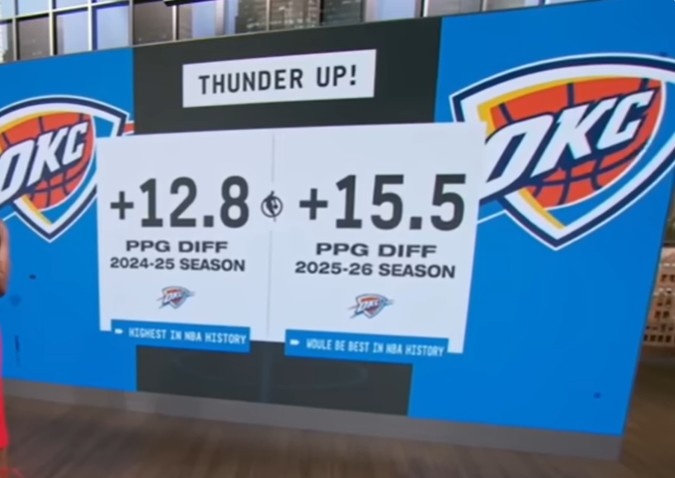 据统计,雷霆上赛季常规赛场均净胜对手12.8分,而本赛季至今,他们场均净胜分达到+15.5分。