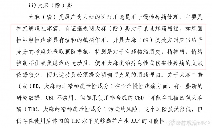 鉴于***酚主要用于治疗慢性疼痛或神经疼痛,而使用***类治疗急性或伤害性疼痛的文献依据较少,所以WADA规定,运动员必须提交明确而充足的用药理由。