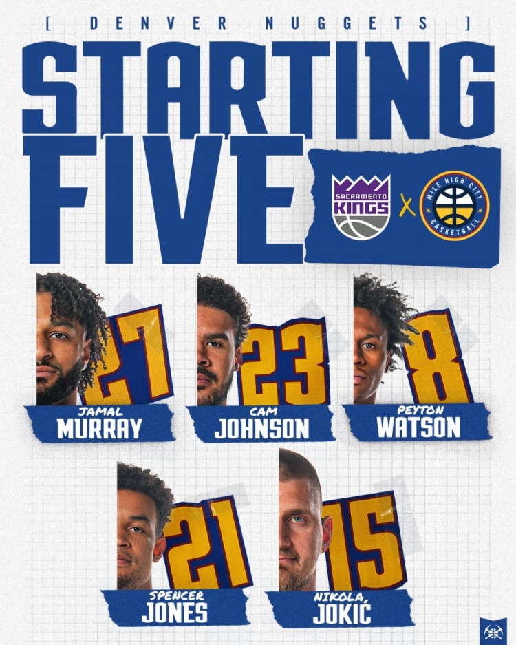 掘金本场首发:穆雷、卡梅隆·约翰逊、斯潘塞·琼斯、沃特森、约基奇。