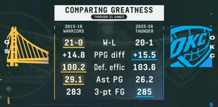 勇士场均净胜分高达+14.8分,雷霆达到了+15.5分