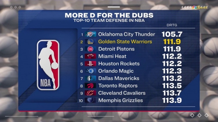 过去三场比赛勇士失分是99/94/91;目前他们防守效率111.9,联盟第二仅次于雷霆。
