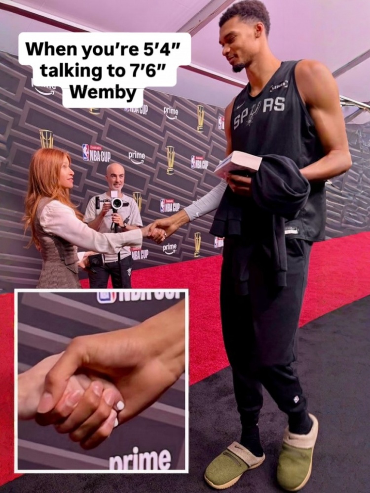 NBA女记者Rachel Nichols晒出了与文班握手照,配文:“当1米63的你和2.32的文班(实为2米24)对话。”