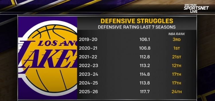 湖人主场迎战灰熊,赛前转播方给出了湖人过去7个赛季的防守效率排名。