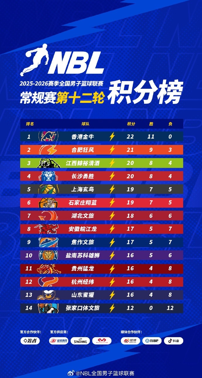 【积分榜】2025-2026赛季NBL常规赛积分榜(截至第十二轮结束)
