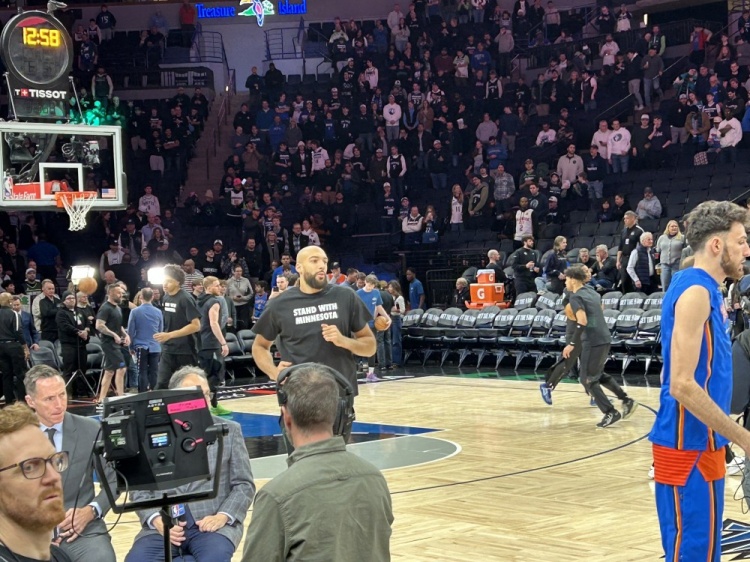 赛前热身环节,森林狼众将身穿印有“与明尼苏达州同在”字样的上衣,为此前的枪击事件发声。