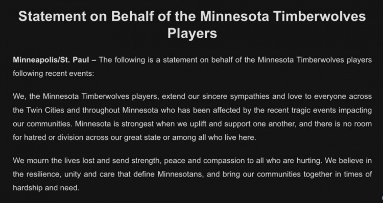 官方写道:“我们,明尼苏达森林狼队的球员们,向整个明尼阿波利斯地区以及整个明尼苏达州所有受到近期这些影响我们社区的悲剧事件所波及的人们,表达我们最诚挚的同情与关爱。明尼苏达的力量在于我们相互支持和帮助,我们这个伟大的州不容许仇恨和分裂。