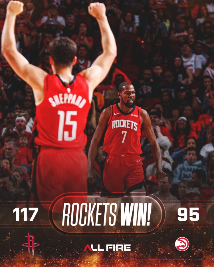 赛后火箭官方发布赢球海报,杜兰特和谢泼德(背影)成为封面人物。