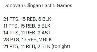 过去五场比赛,克林根全部拿下两双,其中三场20+10。
