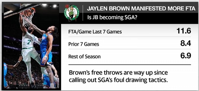 据统计,布朗从吐槽亚历山大罚球起的7场比赛,场均11.6次罚球,而在这之前的7场场均8.4罚,赛季场均6.9罚。
