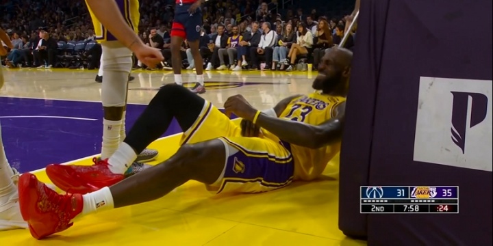 詹姆斯突破倒地左手有些不舒服 起来跟裁判示意被打手了2026-03-31