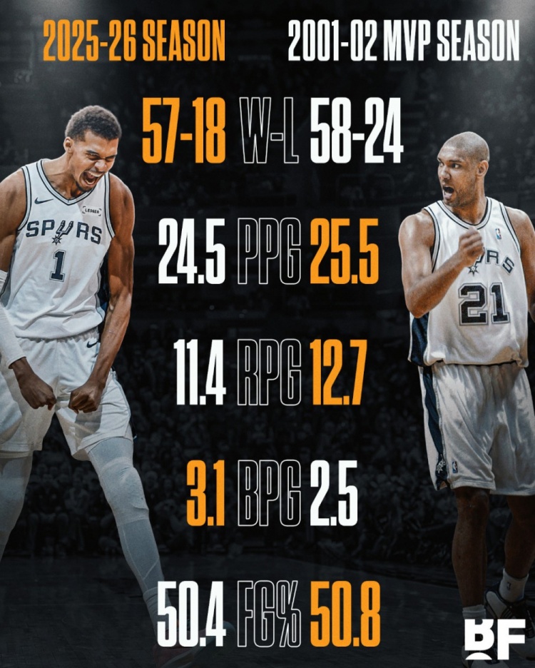 邓肯首夺MVP场均255分127板25帽 文班本赛季245分114板31帽2026-04-02