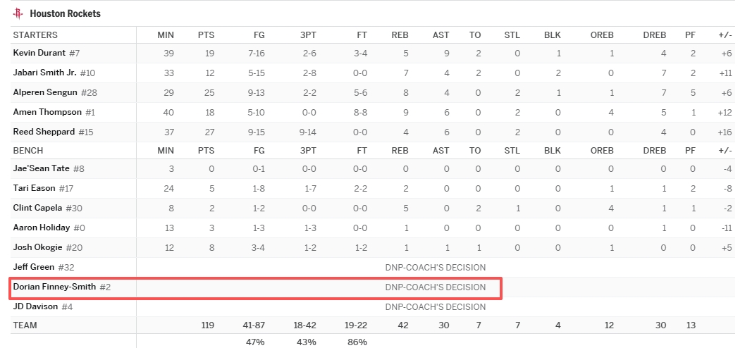 此役,火箭前锋多里安·芬尼-史密斯没有获得出场机会,连续四场比赛被DNP,在此期间球队4胜0负。