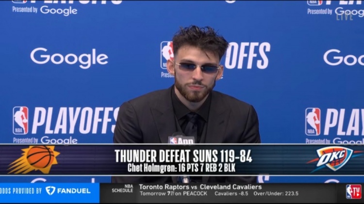 4月20日讯 在今天结束的一场季后赛中,雷霆以119-84战胜太阳。赛后,雷霆球员切特·霍姆格伦出席了新闻发布会。以下是完整版采访内容。
