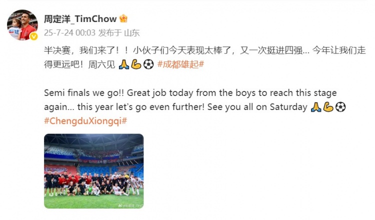 7月24日讯 足协杯1/4决赛,成都蓉城客场2-1击败青岛海牛,晋级四强。赛后,成都蓉城队长周定洋发文庆祝胜利。