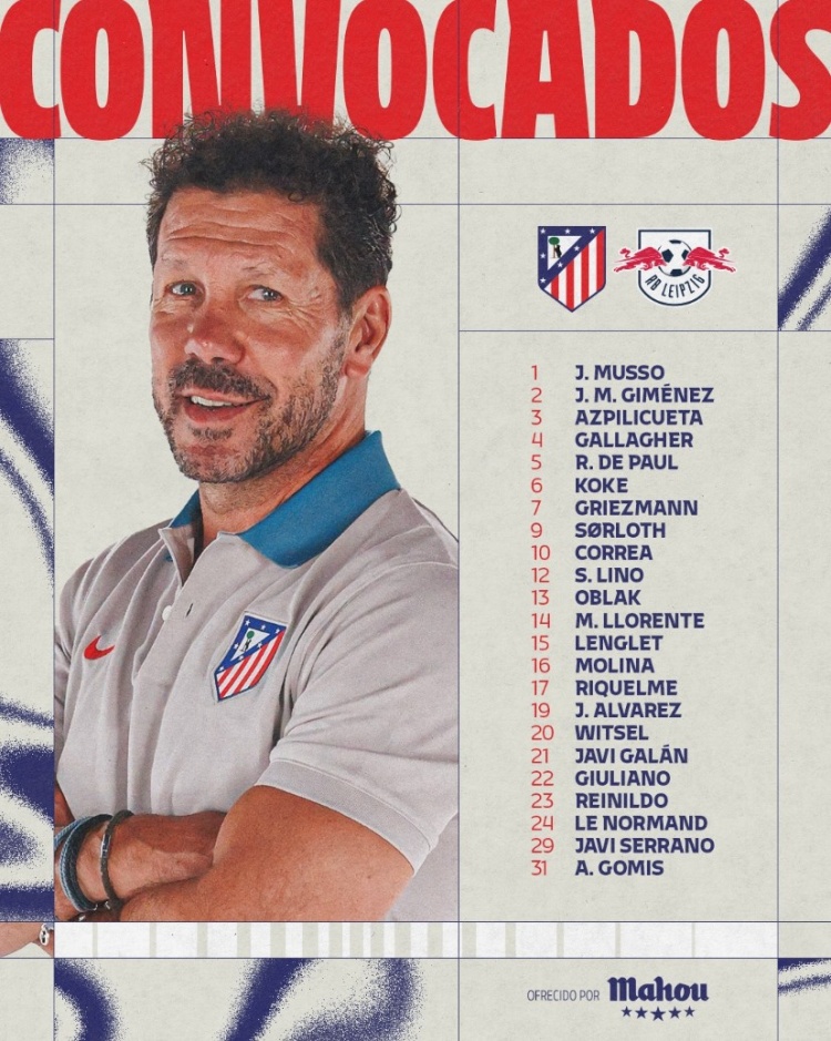 前锋:7-格列兹曼、9-索尔洛特、10-科雷亚、17-里克尔梅、19-阿尔瓦雷斯、22-朱利亚诺-西蒙尼