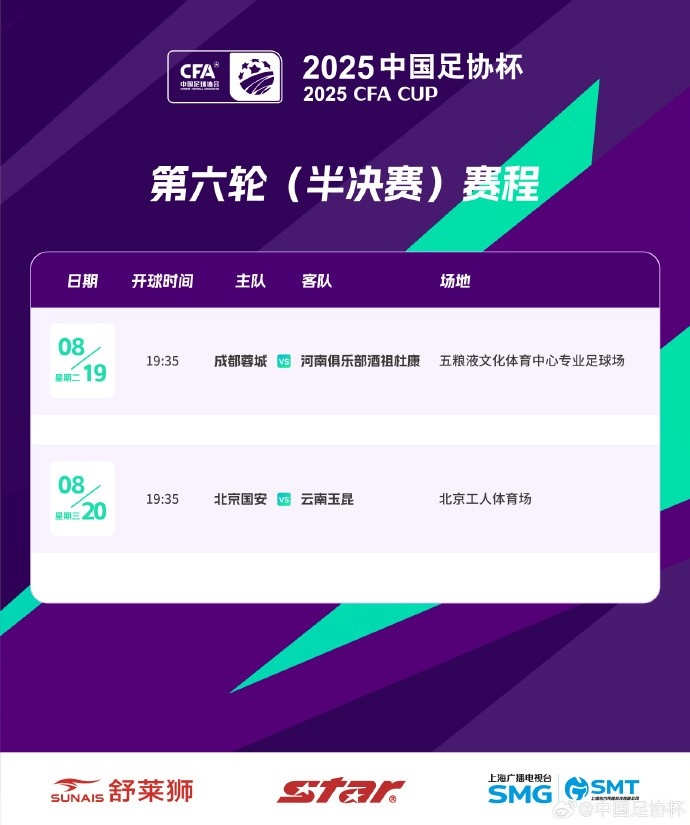 8月6日讯 官方消息,足协杯半决赛时间确定,两场比赛分别8月19日以及20日进行。