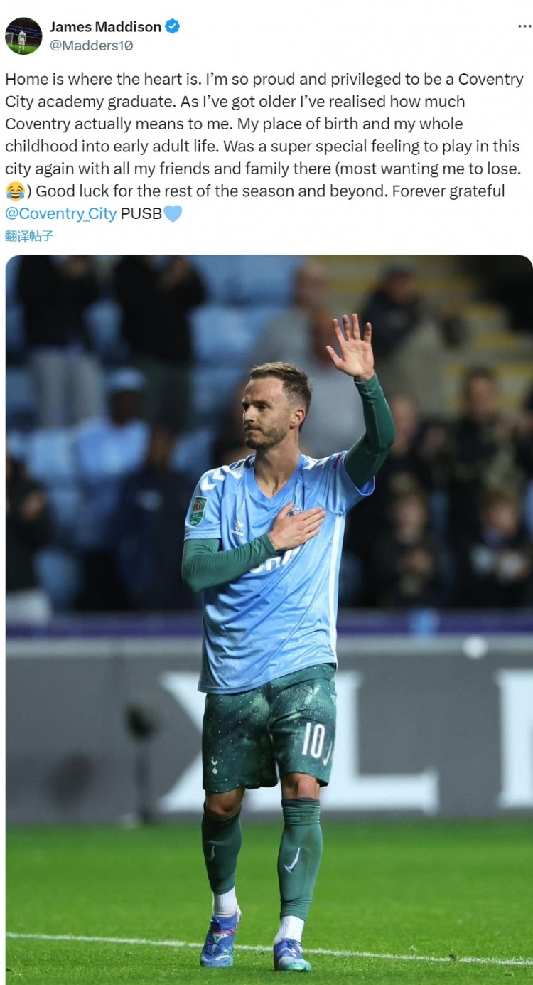 麦迪逊出身于考文垂青训,此役他回到家乡,对阵自己的母队。赛后麦迪逊在社交媒体上晒出自己谢场的照片,并写道:“心在哪里,家就在哪里。作为考文垂青训学院的毕业生,我感到无比自豪和骄傲。随着年龄的增长,我意识到考文垂对我的重要意义。考文垂是我出生的地方,也是我整个童年和成年早期生活的地方。”
